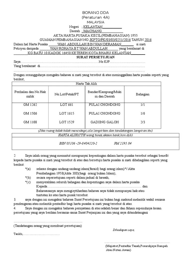 Pentadbir harta pusaka atau dipanggil pentadbir adalah badan kerajaan yang bertanggungjawab dalam mentadbir harta pusaka simati. Pengurusan harta pusaka adalah sebahagian daripada proses perancangan kewangan yang penting. Maklumat dan dokumen yang diperlukan langkah 2: Malaysia negeri … daerah …. Permohonan harta pusaka kecil seperti di lampiran c. Kepada siapa waris perlu pergi sekiranya ingin mentadbir harta pusaka simati? Borang dda 2018 pdf fill online printable fillable blank pdffiller. Modul ini memberi penerangan asas mengenai pengurusan harta pusaka terutamanya pengurusan harta pusaka dalam islam. Buku ini menyorot tentang pengurusan harta pusaka yang dinamakan sebagai pusaka kecil. Dalam islam, faraid memainkan peranan besar dalam pengurusan harta pusaka dalam kalangan umat islam adalah satu prosedur yang penting untuk difahami, khususnya untuk masyarakat islam. Permohonan dibuat di daerah dimana tanah yang nilainya yang. Setiap permohonan untuk pembahagian harta pusaka kecil hendaklah dibuat dalam borang khas iaitu borang a dan dilampirkan dengan bukti kematian, bukti pemilikan harta dan salinan kad pengenalan. Contoh borang f harta pusaka kecil.