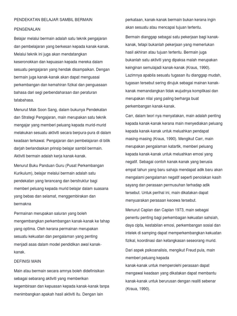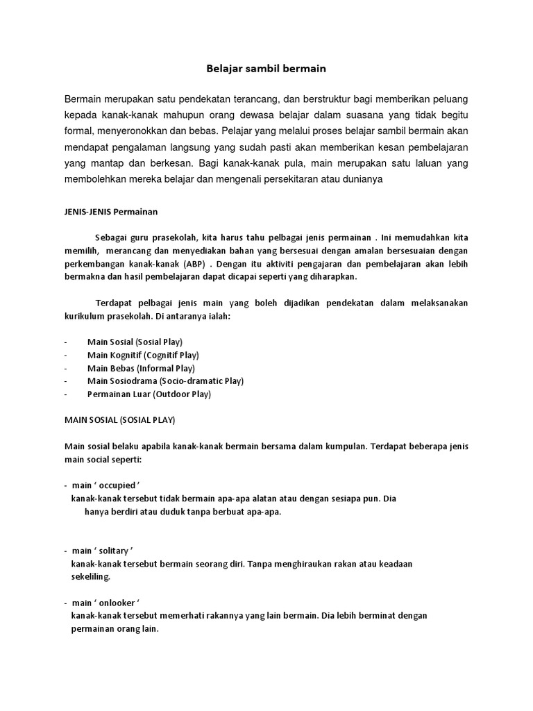 Garis panduan yang sedemikian di dalam kurikulum prasekolah kebangsaan menampilkan satu persamaan iaitu penglibatan aktiviti menyeronokkan. Pendekatan belajar sambil bermain 1) bermain untuk perkembangan fizikal. Pengenalan dan kesediaan murid √ murid berada dalam keadaan baik untuk belajar apabila mendapati reaksinya terhadap. 0 penilaian 0% menganggap dokumen ini bermanfaat (0 suara) 5 tayangan 5 halaman. Te bee yong ipg kampus batu lintang, kuching sarawak.
